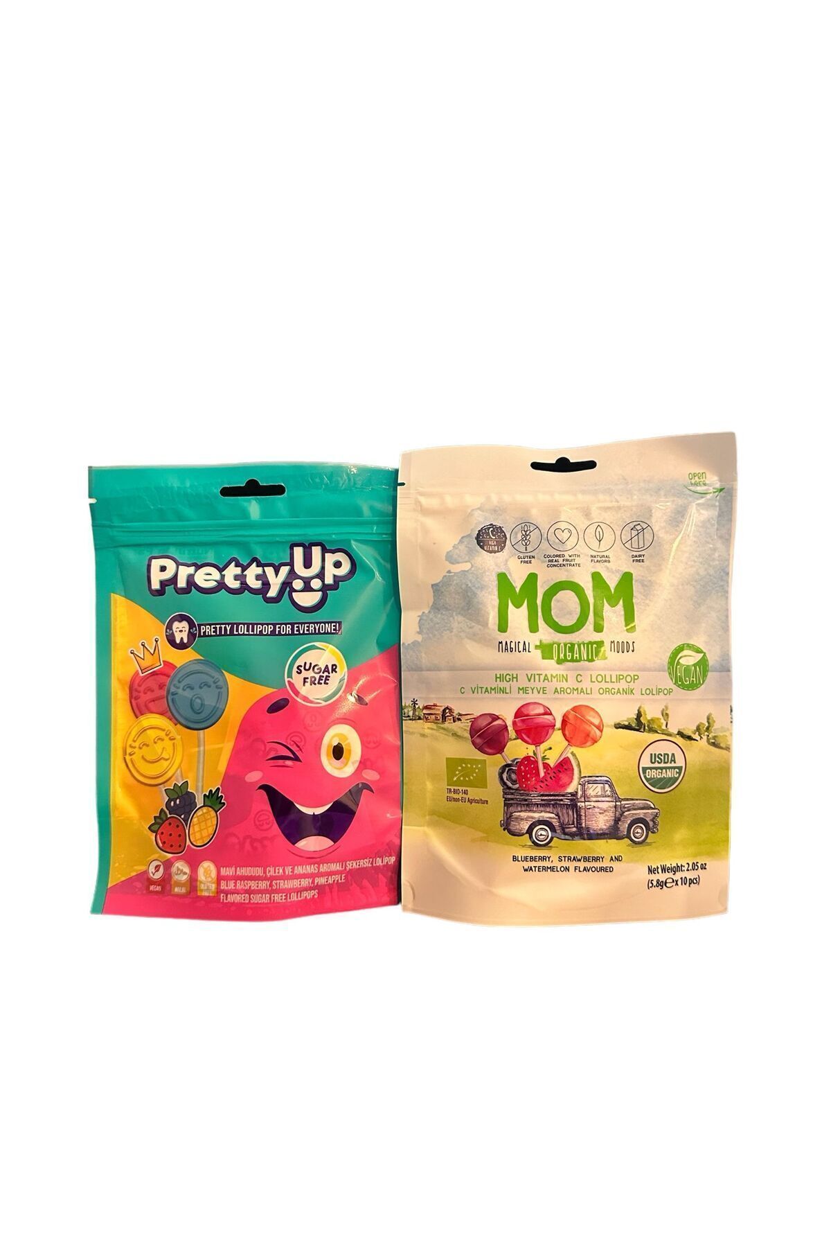 MOM ORGANİK LOLİPOP 3 farklı lezzet bir arada, Yaban Mersini, Çilek ve Karpuz Aromalı C Vitaminli Organik Lolipop Her bir pakette 10 adet Lolipop bulunmaktadır. ; 5,8 Gr x 10 adet 1 paket olmak üzere toplamda 2 paket (20 adet lolipop) gönderilmektedir. ; Magical Organic Moods (MOM) doğal içeriğiyle sosyal bilinci göz önünde bulundurarak, organik deneyim sunar. ; Ürünlerimizde hiçbir yapay bileşen yoktur. ; Çocukların ve yetişkinlerin, sağlık açısından kullanımında bir sakınca yoktur. ; USDA & BIO sertifikalı Türkiye’de ilk üretilen Organik Lolipop Lezzetli Meyve Konsantreleri ile Renklendirilmiş, Doğal Aromalı Gluten, Süt Ürünü ve Alerjen içermez. ; PRETTY UP ŞEKERSİZ LOLİPOP ÇİLEK, ANANAS VE MAVİ AHUDUDU AROMALI Şekersiz güzel bir lolipopla anın tadını çıkarın Pretty Up Lolipop’larla kendinizi şımartın! Tamamen doğal tatlarda ve diş dostu, mükemmel bir lollipoptur. ; Keyifli tatlar ve doğal renklerle yapılan her yalama lezzetle doludur. ; Tatlı ihtiyacınızı karşılayan farklı bir seçeneğin tadını çıkarın. ; Pretty Up Lolipoplar gluten içermez. ; Vegan ve şekersiz bir içeriğe sahiptir. ; 5,5 Gr x 10 adet 1 paket olmak üzere toplamda 2 paket (20 adet lolipop) gönderilmektedir.;