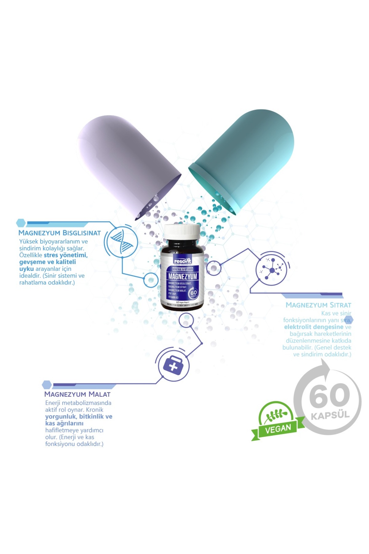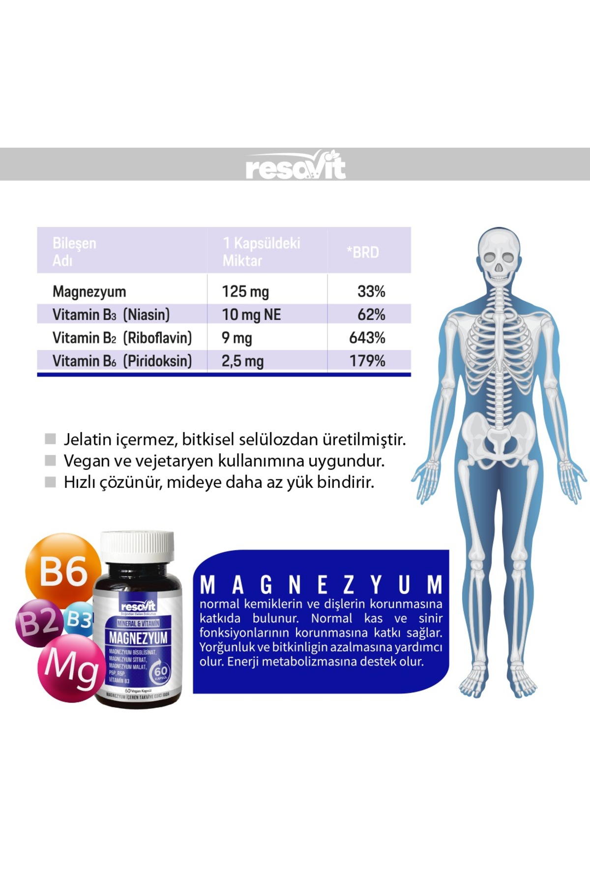 RESAVİT Magnezyum 3’lü Form, Bisglisinat, Sitrat ve Malat formundaki Magnezyum çeşitleriyle desteklenmiş, bitkisel kapsül ile üretilmiş güçlü bir formüldür. Vitamin B2, B3 ve B6 ile zenginleştirilmiş içeriğiyle hem zihinsel hem de fiziksel yorgunluğa karşı dengeli bir destek sunabilir.