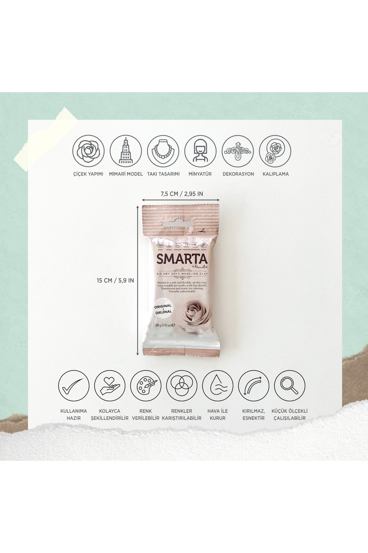 Smarta her türlü hobi, eğitim ve profesyonel amaçlı çiçek, dekor, figür, aksesuar, takı, minyatür ve sanatsal aranjmanlar yapabileceğiniz bir modelleme hamurudur. ; Hava ile ortalama 24 saatte kurur. Fırınlama gerektirmez, enerji sarfetmez. ; Kullanıma hazırdır. Yumuşak yapılıdır, kolay şekillendirilir. ; Esnek yapılır. Kırılmalara ve darbelere karşı dayanıklıdır. ; Her türlü akrilik, yağlı boya ve soft pastelle renk verilebilir. 28 farklı renk seçeneği bulunan Smarta renkleri birbiriyle karıştırılarak yeni renkler elde edilebilir.; Kalıp ve kesicilerle çalışmaya oldukça uygundur. Yüzey desenlerini başarıyla aktarır. ; Metal, cam,ahşap, plastik gibi birçok yüzeye uygulama yapabileceğiniz Smarta ile sanatın yenilikçi ve keyifli haline siz de merhaba diyin! 🙂 ;