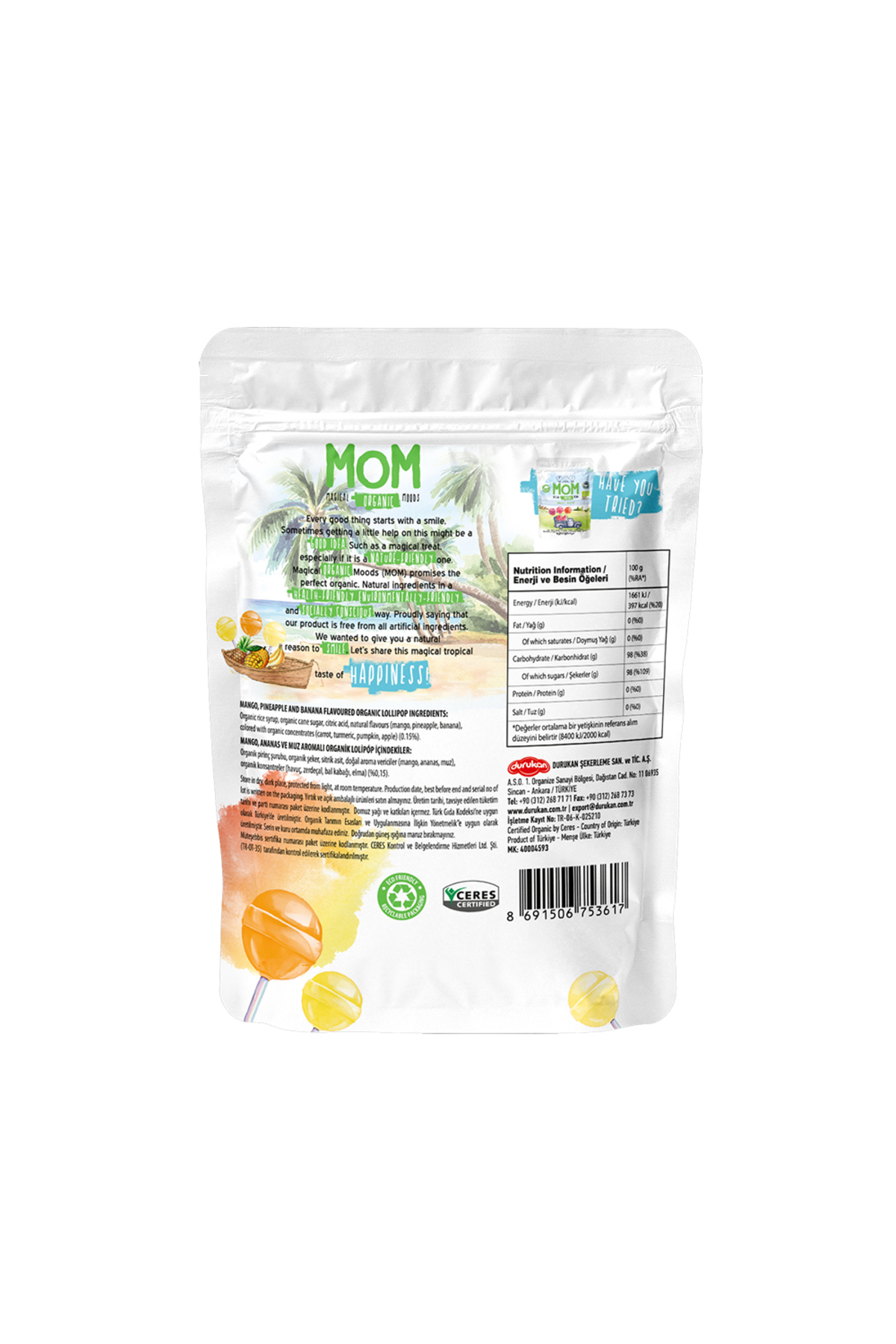 Mom Organik Tropikal Lolipop 3’lü Paket Mom Tropikal Organik Lolipop – Ananas, Muz, Mango Tropik adaların taptaze meyveleri şimdi tek pakette! Magical Organic Moods’un yeni Mom Tropikal serisi, tropik meyvelerin en sevilen üç lezzetini bir araya getiriyor İçerikler & Özellikler Organik Lolipop (Ananas, Muz, Mango) – 10 adet Gerçek Meyve Konsantresi ile renklendirilmiş Organik Tarım ve BIO sertifikalı – Türkiye’de ilk üretilen organik lolipop Gluten içermez Süt ürünü içermez GDO’suz Alerjen içermez Çocukların güvenle tüketebilmesi için plastik yerine sağlığa zararsız sert kâğıt çubuk kullanılmıştır.;