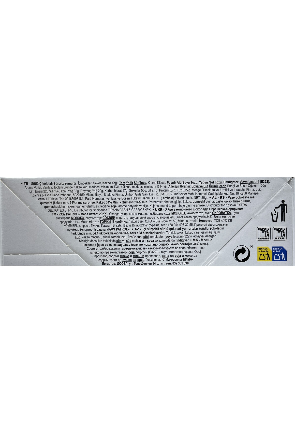 Paw Patrol Glutensiz Çikolatalı Sürpriz Yumurta 20 g (1 ADET) Çocuklarınızın Favori Kahramanları Şimdi Glutensiz Sürpriz Yumurtada! Çocukların en sevdiği çizgi film kahramanları Chase, Marshal, Skye ve tüm Paw Patrol ekibi, şimdiye kadarki en tatlı görev için hazır! Bu özel sürpriz yumurta, iki büyük mutluluğu bir araya getiriyor: nefis bir çikolata lezzeti ve heyecan verici bir Paw Patrol sürprizi! En Önemlisi: %100 Güvenli ve Glutensiz! Bu ürünü benzerlerinden ayıran en önemli özelliği, tamamen glutensiz olarak üretilmesidir.; Artık gluten hassasiyeti veya çölyak rahatsızlığı olan çocuklar da sürpriz yumurta keyfinden mahrum kalmayacak.; Ebeveynlerin içi rahat, çocukların yüzü gülecek! Neden Paw Patrol Sürpriz Yumurta? %100 GLUTENSİZ: Çocuğunuz için güvenli bir atıştırmalık arıyorsanız, glutensiz sertifikalı bu yumurta tam size göre.; Lezzetli Çikolata: Dışı, çocukların damak tadına uygun, kaliteli ve lezzetli 20 gramlık çikolata kabuğundan oluşur.; Heyecan Dolu Sürpriz: Her yumurtanın içinde, çocukların hayran olduğu Paw Patrol karakterlerinden birinin oyuncak figürü veya temalı bir sürpriz gizli.; Koleksiyon Keyfi: Acaba içinden hangi kahraman çıkacak? Her yumurta yeni bir heyecan demek! Çocuklar tüm Paw Patrol ekibini biriktirmek için sabırsızlanacak.; Mükemmel Hediye: Hem eğlenceli bir oyuncak hem de tatlı bir kaçamak; doğum günleri, karne hediyeleri veya “sadece içimden geldi” anları için harika bir seçenektir.; Hem lezzetli, hem eğlenceli hem de glutensiz bir mutluluk için daha ne bekliyorsunuz? Orjinal lisanslı üründür.; Tek adet sürpriz yumurta fiyatıdır.;