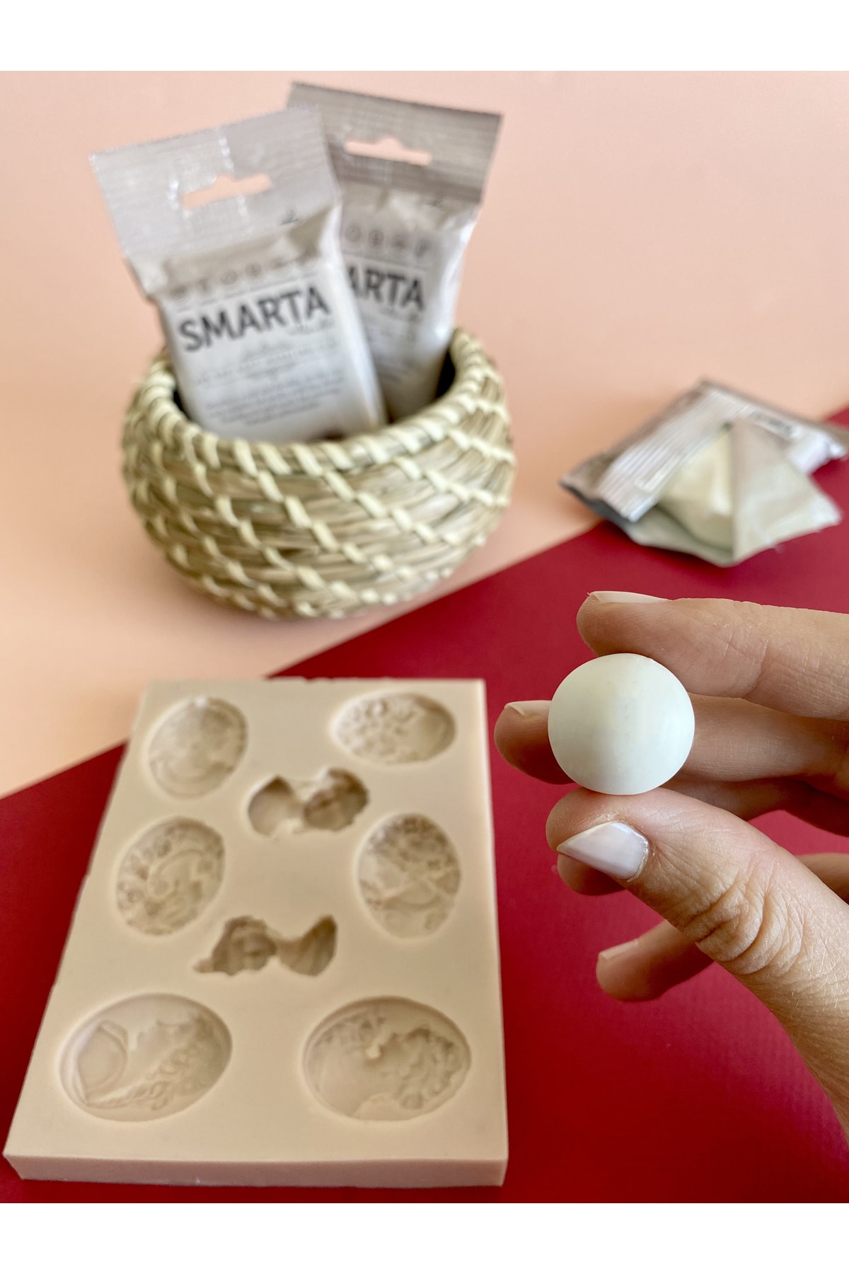 Smarta™Silikon Kalıp – Kameolar, Smarta hava ile kuruyan modelleme hamuru ile uyumlu çalışır. ; En iyi sonuç için bir parça hamuru elinizde yumuşatın, hamuru silikon kalıbın hücresine sıkıca yerleştirin, nazikçe kalıptan çıkarın, silikonu hafifçe hareket ettirip silikonla yaptığınız şekil arasının açılıp hava almasını sağlayın. ; Hamurun silikondan kolay çıkması için şeklin etrafının silikon duvarlarından ayrılması önerilir. ; Kullanılacak yüzey cam ise suyla, diğer yüzeylere beyaz tutkal ile yapıştırılabilir. ; Şekillendirilmiş hamur toz pastel, akrilik boya ve yağlı boya ile boyanabilir. Kuruyan şekil üzerine varak ve cila yapılabilir. ; Tozlanan kalıp sabunlu suyla yıkanabilir. ; Kutusunda muhafaza edilmesi önerilir. ; Kalıp ebatı:100x130x15mm